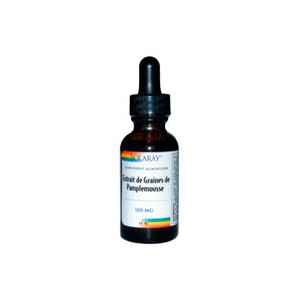 Extrait de graines de Pamplemousse 100 mg - 30 ml (Solaray) - , Ce produit est à base d'extrait de graines de pamplemousse. Ses composants ont un large spectre et constituent une première ligne de défense pour le corps.100 dose de 10 gouttes.Mélanger entre 5 et 10 gouttes d'extrait de graines de pamplemousse avec de l'eau ou du jus de fruit.